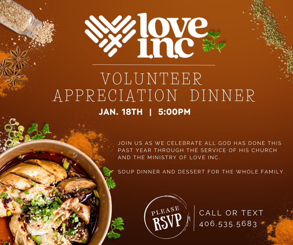 RSVP today and help us grow the impact of Christ’s love in our community. Call or text Love INC at (406) 535-5683.