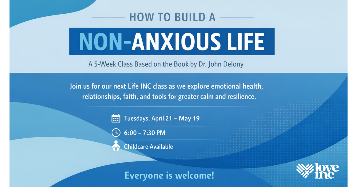 Our next Life INC class is all about how to build a non-anxious life - a topic that we can all relate to! Whether you're a Love INC client or not, this class is for you. Let's learn together how to build lives that are more peace-filled and abundant.